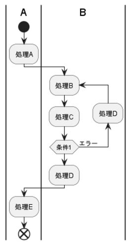 アクティビティ図で書く業務フローは、repeate 、while を書く時にレーンを書く時に気をつけないと 崩れてしまう。 片側のレーンだけに寄せた描画の例 repeat @startuml |A| start :処理A; |B| repeat:処理B; :処理C; backward :処理D; repeat while(条件1) …